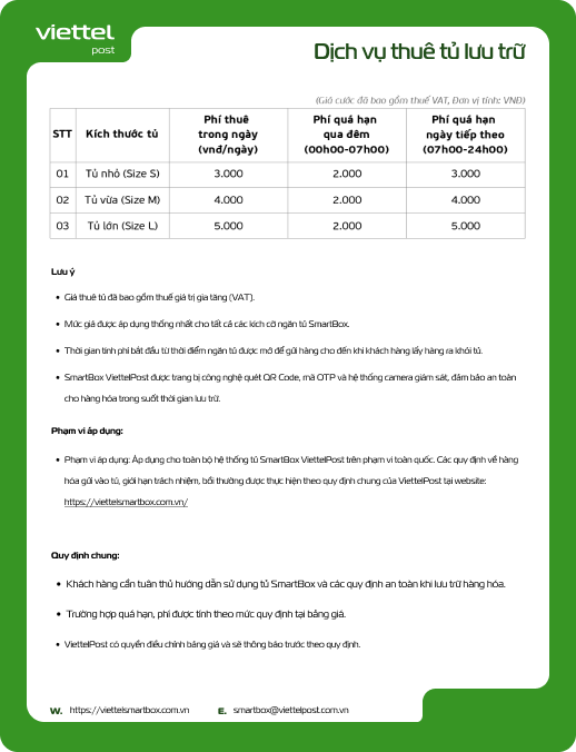 Dịch vụ thuê tủ lưu trữ SmartBox cho phép cá nhân và doanh nghiệp chủ động thuê ngăn tủ thông minh để giao, nhận và lưu trữ hàng hóa, bưu kiện, đồ cá nhân hoặc tài liệu một cách an toàn và linh hoạt. Hệ thống tủ hoạt động 24/7, hỗ trợ xác thực bảo mật, giúp người dùng tiết kiệm thời gian, không phụ thuộc vào nhân sự hay giờ hành chính.